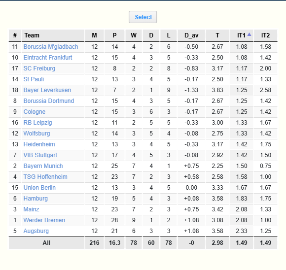 Фильтр Интервалы матча означает, что вы можете отдельно анализировать интервалы матча команды, когда она выигрывала, играла вничью или проигрывала. После применения фильтра длительность в минутах выбранного интервала(ов) будет отображаться в каждом матче. Средние данные рассчитываются на основе 95 минут (средняя продолжительность футбольного матча). Фильтр очень полезен для ставок в лайве, потому что не секрет, что в зависимости от текущего счета стиль игры команды может сильно различаться, и это напрямую влияет на то, как команда держит мяч, подает угловые, получает карточки и др. x |