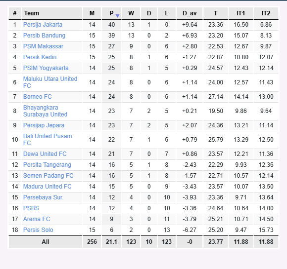 МКоличество матчей ОКоличество очков П1Количество побед ХКоличество ничьих П2Количество поражений РазнОбщая разница Разн_срСредняя разница ТСредний тотал в матче ИТ1Средний тотал в матче команды ИТ2Средний тотал в матче команды-противника Proc Games Procent ((Choosen matches / All matches) * 100) Odds All matches / Choosen matches 20 29 7 8 5 26 - 18 +0.4 2.2 1.3 0.9 Дата Турн Турнир Р Раунд/Тур Ком1 Домашняя команда Ком2 Гостевая команда П1 Коэффициент на победу хозяев Х Коэффициент на ничью П2 Коэффициент на победу гостей 09/12/25 AFC 6 Мачида Зельвиа 3 1 Ульсан Хёндэ 1.48 4.11 7.25 + 06/12/25 J1L 38 Касива Рейсол 1 0 Мачида Зельвиа 1.70 3.88 5.44 + 30/11/25 J1L 37 Мачида Зельвиа 3 1 Нагоя Грампус 1.70 4.00 5.21 + 25/11/25 AFC 5 Gangwon FC 1 3 Мачида Зельвиа 3.40 2.91 2.43 + 22/11/25 EmpCup 29 Мачида Зельвиа 3 1 Виссел Кобе 3.35 2.91 2.53 + 16/11/25 EmpCup 28 Мачида Зельвиа 0 0 Токио 2.02 3.07 4.53 09/11/25 J1L 36 Мачида Зельвиа 0 1 Токио 2.00 3.42 4.24 + 04/11/25 AFC 4 Мачида Зельвиа 1 2 Мельбурн Сити 1.34 5.00 8.96 + 25/10/25 J1L 35 Урава Ред Даймо 0 0 Мачида Зельвиа 3.31 3.32 2.36 21/10/25 AFC 3 Шанхай Порт 0 2 Мачида Зельвиа 5.13 4.58 1.56 + 18/10/25 J1L 34 Мачида Зельвиа 0 0 Ависпа 1.75 3.71 5.30 04/10/25 J1L 33 Хиросима 2 1 Мачида Зельвиа 2.26 3.29 3.55 + 30/09/25 AFC 2 Kelab Bolasepak 0 0 Мачида Зельвиа 2.46 3.41 2.86 27/09/25 J1L 32 Мачида Зельвиа 1 0 Fagiano Okayama 1.68 3.97 5.40 + 23/09/25 J1L 31 Киото Санга 1 1 Мачида Зельвиа 3.84 3.39 2.11 + 16/09/25 AFC 1 Мачида Зельвиа 1 1 Сеул 1.44 4.62 6.81 + 12/09/25 J1L 29 Мачида Зельвиа 1 1 Yokohama FC 1.49 4.37 7.72 + 31/08/25 J1L 28 Кавасаки Фронта 5 3 Мачида Зельвиа 2.96 3.51 2.47 + 27/08/25 EmpCup 27 Мачида Зельвиа 3 0 Кашима Антлерс 1.87 3.63 4.32 + 23/08/25 J1L 27 Йокогама Ф-Мари 0 0 Мачида Зельвиа 4.33 3.69 1.89 Дополнительные фильтрыТотал голов: Фора: Счет первого тайма: Пенальти: Удаление: