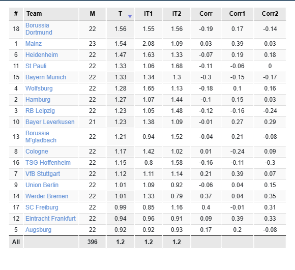 Borussia Dortmund имеет наибольшее отношение тотала угловых 2 тайма к тоталу угловых 1 тайма в турнире Bundesliga (Germany) (1.56)