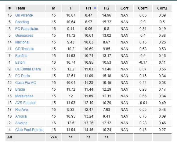 Gil Vicente имеет лучшее отношение владения мячом к угловым в турнире Primeira Liga (Portugal) (8.47% владения на 1 угловой)